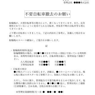 「避難訓練・消火訓練のお知らせ」の掲示物。避難訓練と消火訓練のお知らせです。各マンションの内容に応じて書き換えてください。普段通行しない階段や動線を確認することで、意識を高めてもらうきっかけになります。消火訓練は、消防署に相談するとよいでしょう。